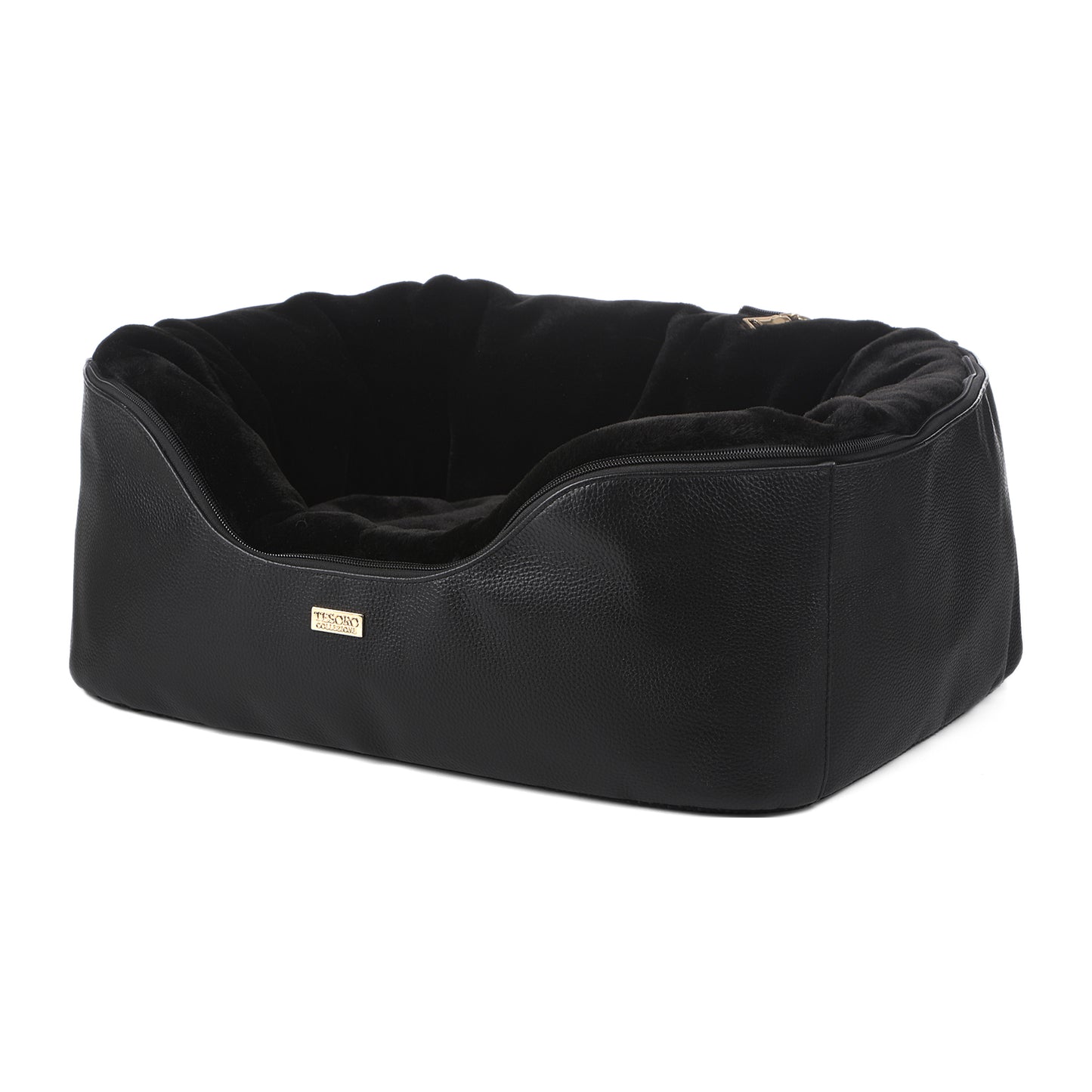 The removable cover with a hidden zipper allows for easy care, and the leather exterior can be wiped clean to maintain its polished look. Finished with a subtle Tesoro Collezione logo, this designer dog bed is a stylish and practical choice for pet owners seeking premium dog furniture.
